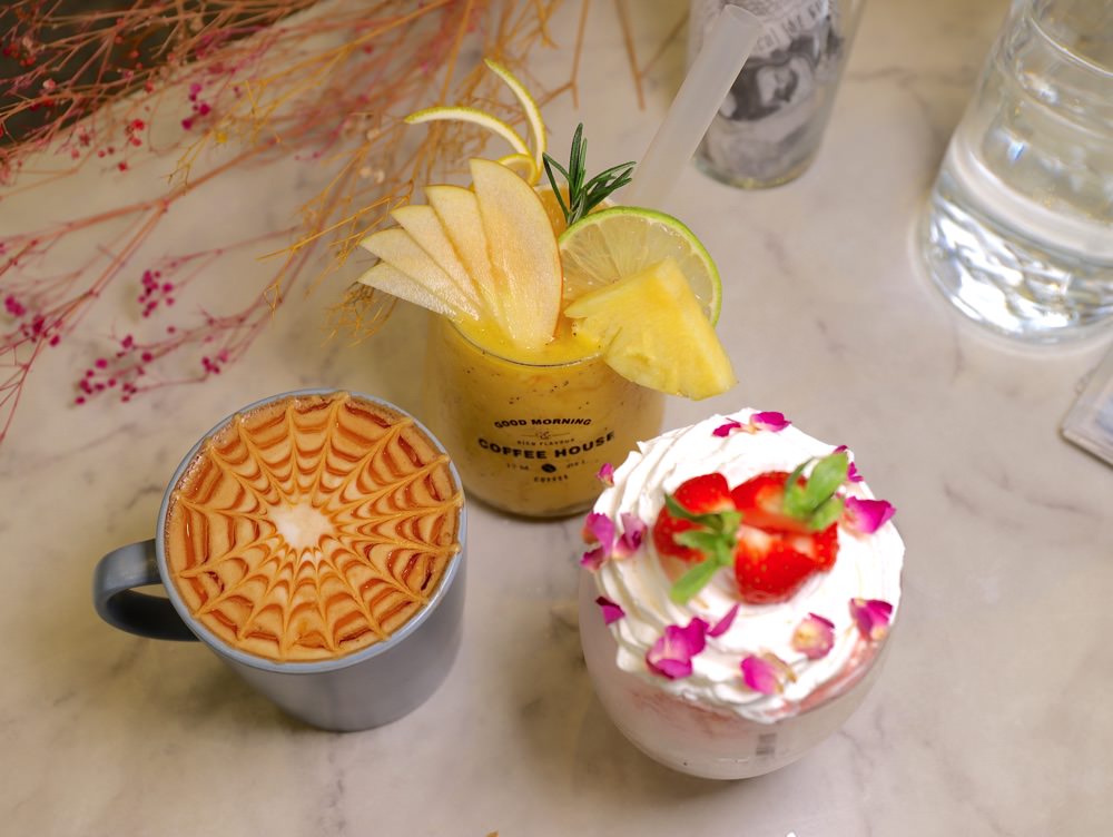 ▼《 焦糖瑪其朵$140 / 夏威夷鮮果冰沙$150 / 草莓奶昔$150 》