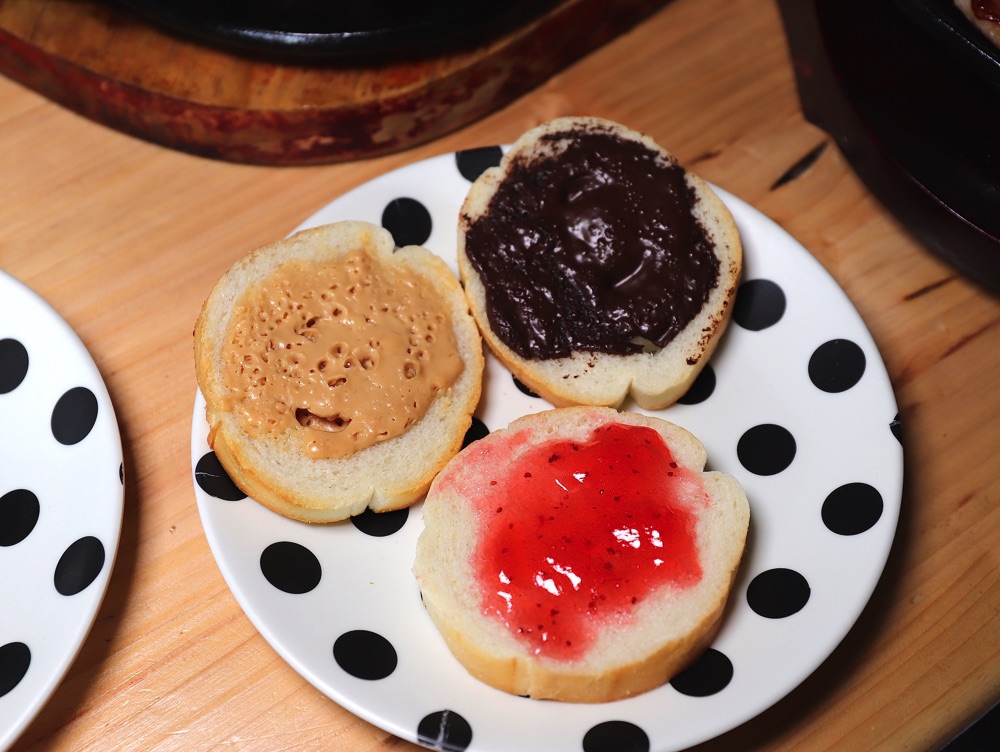 果醬有三種:巧克力、花生、草莓,愛吃哪種就自己塗~
