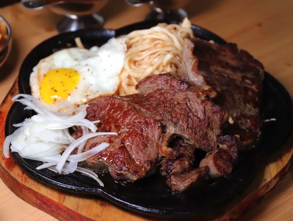 每份鐵板排餐,除了主菜肉品外,還會有鐵板麵(可換白飯)、太陽蛋、洋蔥絲~